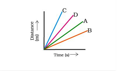 Four cars A, B, C and D are moving on a levelled road. Their distance versus time graphs are shown in Fig. 8.2. Choose the correct statement